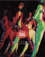 Crazy Horse疯马俱乐部始于1951年,以纯正法式风格和口味的浪漫艳舞而著称。其特色就是将L体、灯光、布景与歌舞结合,营造出声、光、色、裸的;新境界位于巴黎中心金三角地区的疯马夜总会(CRAZY HORSE)由阿兰.贝纳丹( Alain Bernardin )创立于1951年。这个夜总会的演出,细腻的表达了情色之美,融合纯正的感官刺激,给人们留下具有创造性,艺术性与神秘夜巴黎的深刻印象。 阿兰.贝纳丹( Alain Bernardin ) 认为L体艺术表达了艺术革新的本质。疯马夜总会这种类型的演出不是产生于那一天,而是一个时期演变的产物。在巴黎那些年代悠久的表演俱乐部当中,与之齐名的;红磨坊却可能更为我们所熟悉,不仅是因为那部由妮可.基曼出演的同名影片,其它以红磨坊为背景或素材的影片也着实是有一些。其实说起疯马,它与红磨坊的风格真是迥异其趣。红磨坊的乐舞尽人皆知是一派夸张喧闹、色彩缤纷、羽饰缭乱的欢腾,尤其是那种羽毛装是其最大特色,而疯马的创始人Alain Bermardin从一开始即决定另辟蹊径,在他的俱乐部舞台上彰显L体美学,去除掉多余的修饰和夸张的衬托,营造一种简洁、神秘、耐人寻味的光影视觉效果,以富有想像力的肢体表演独步天下。 即是裸舞秀,当然就一般理解而言也就是艳舞了,何况疯马的舞者清一色年轻漂亮的女孩,身材高挑,容貌标致,被誉为秀场的维纳斯,演出时又是半裸或接近全裸,自然无限延展了观众的想像空间。但拜托各位不要联想到那些低级场所的托衣舞、钢管舞,艳舞也并不必然的和色情、**秽联系在一起,艳舞也可以是如此富有美感的、如此艺术的舞台表演,结合灯光、布景和编舞设计,达到声、光、色一体,赏心悦目。要知道,这可是50多年历久不衰的顶级裸舞表演,半个多世纪以来,疯马任凭斗转星移却始终坚持当初的美学理念,非关色情,不涉**秽,一代代的绝色美女在这里演绎着人体、歌舞、艺术的集大成,那真是千娇百媚,颠倒众生。